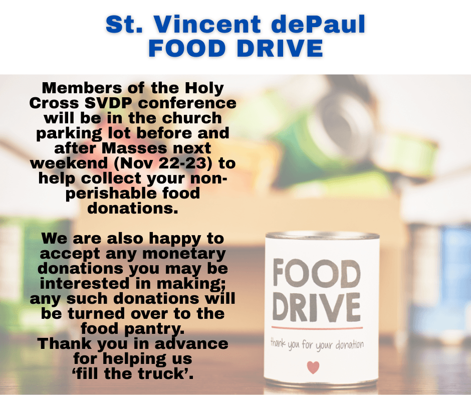 As we approach the Thanksgiving holiday, the Holy Cross St. Vincent DePaul (SVDP) Society will be holding a food drive to benefit the SVDP food pantry. There will be an SVDP truck parked in the church parking lot next weekend (22/23rd). As I’m sure you all understand, the need to support our area’s food pantries is at an all-time high.